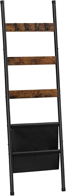 HOOBRO Blanket Ladder, 5 Tier Towel Rack, 17.3″ L x 63″ H, Wall-Leaning Blanket Rack for Living Room, Decorative Ladder with 4 Hooks and Magazine Pocket, Rustic Brown BF32CJ01