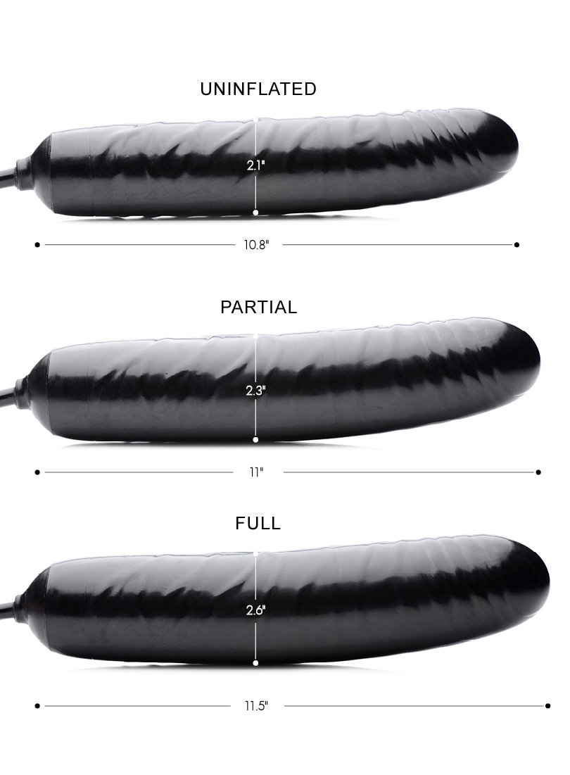 The Trinity Inflatable Dildo is designed to fulfill your ultimate desires! With each squeeze of the hand pump, the ridged shaft and bulbed base inflate and increase in girth and stiffness for incredible sensations. A release valve allows you to easily adjust the size and find the perfect fit that’s sure to satisfy. Measurements: Approx. 11 inches long and 8.25 inches in circumference at base when deflated. Shaft approx. 6.25 inches in circumference when deflated. Material: Rubber. Color: Black.