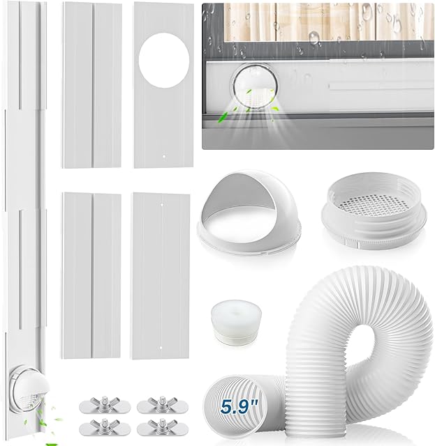 Insputer Portable AC Window Vent Kit with 5.9″ Exhaust Hose & Coupler, Adjustable Air Conditioner Window Seal Kit for Sliding Vertical/Horizontal Windows (4 Pcs)