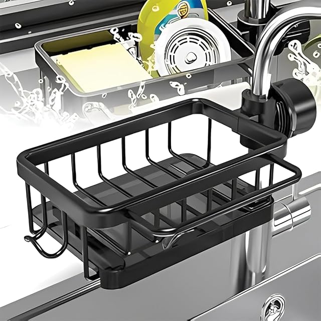 Order Kitchen Sink Faucet Organizer, 2025 Upgrade, Adjustable Detachable Sponge Holder, Soap Kitchen Sink Drain Rack with Tray & Towel Hook Bathroom Universal Size Fits 1.8-2.8cm Round Pipe (Black Left) today for a best price.