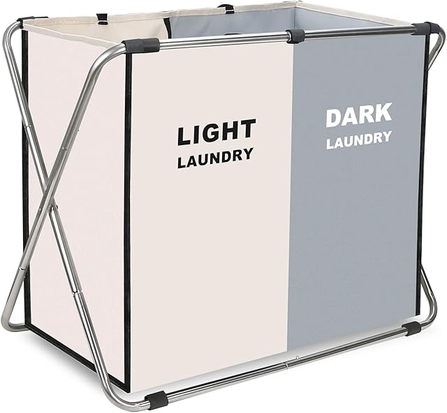 Laundry Cloth Hamper Sorter Basket Bin Foldable 2 Sections with stainless steel Frame Washing Storage Dirty Clothes Bag for Bathroom Bedroom Home Storage Basket (White+gray, 2 Sections)