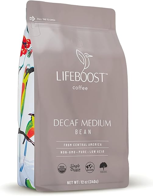 Lifeboost Medium Roast Decaf Coffee Beans – Organic Low Acid Swiss Water Decaf – Whole Bean Coffee – Third Party Tested for Mycotoxins & Pesticides – Chemical Free – 12 oz