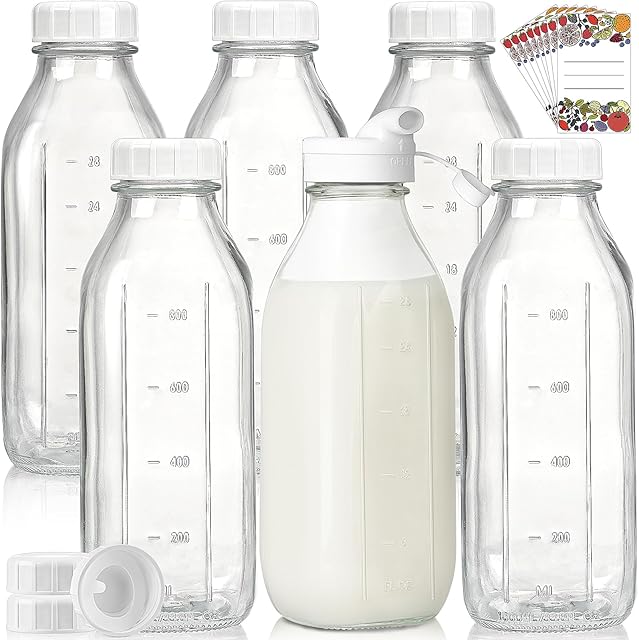 Liter Glass Milk Bottles w 100% Airtight Heavy Duty Screw Lid – 6 Pack 32 Oz Drinking Jars – Food Grade Glass Bottles for Milk, Honey, Jam – Dishwasher Safe(Extra 2 Lids and Stickers Included)