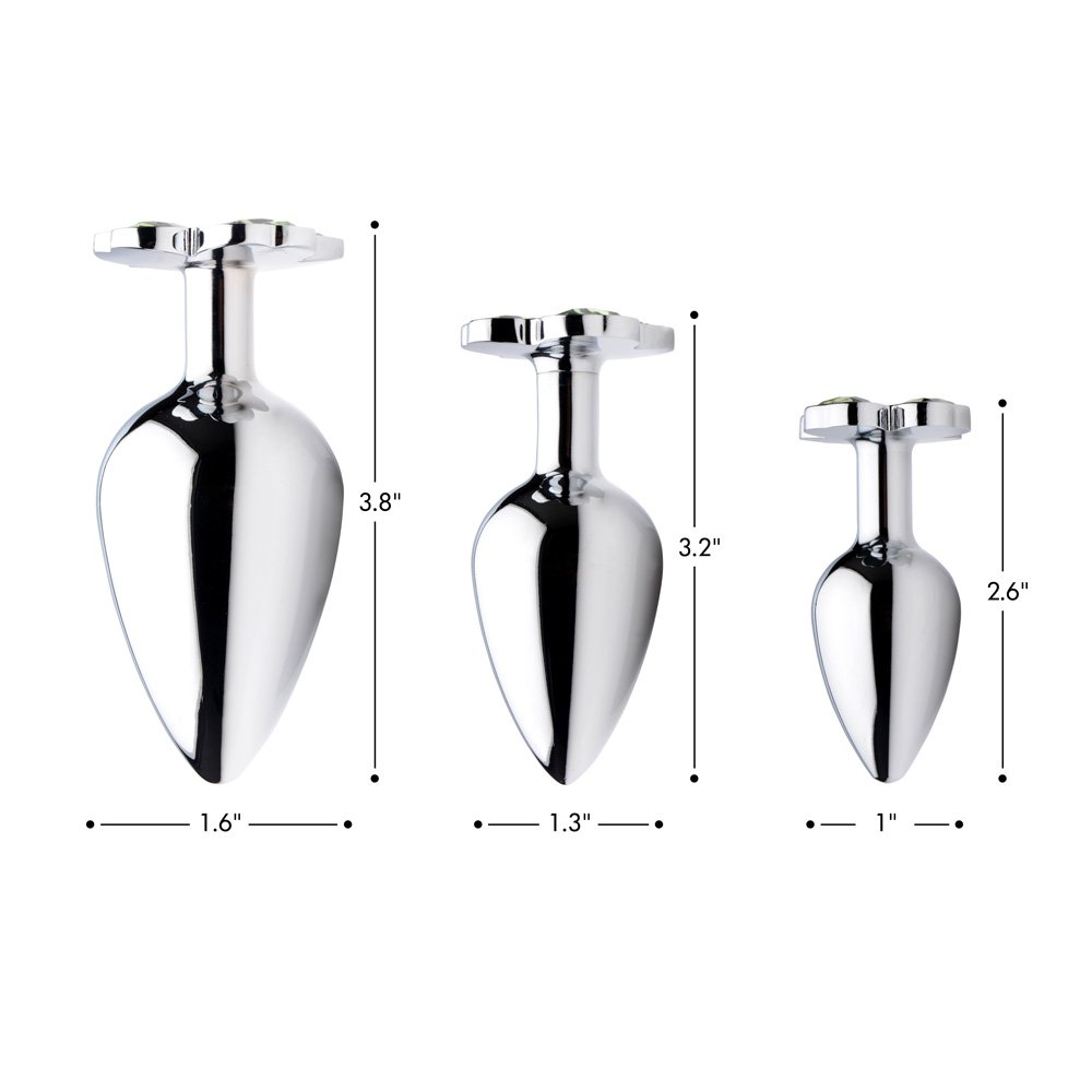 Make that booty get lucky with this hefty metal anal plug with a clover jewel design at the base! Pop this lucky charm in your pot-o-gold to appreciate the comfortable weight inside your body, thanks to the nickel-free aluminum alloy material. Great for temperature play, you can warm it or cool it in water before insertion. The attractive shape of the base will surprise your partner when you bend over. Shake that shamrock! Use with any lubricant of your choosing and clean after use with mild soap or toy cleaner. Measurements: 3.8 inches in total length, 3.4 inches insertable length, 1.6 inches at widest diameter, .48 inches in diameter at stem Material: Aluminum alloy, ABS plastic Color: Green