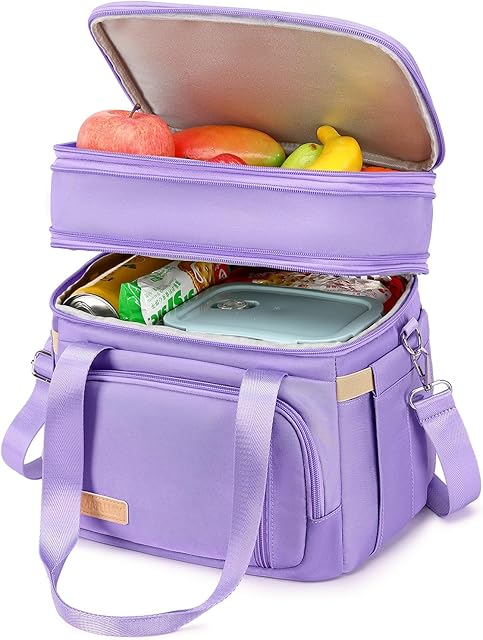 Lunch Box for Men Women – Double Deck Insulated Lunch Bag, Large Leak Proof Tote Cooler, Wide Open Dual Compartment Lunch Bags with Shoulder Strap, For Work Picnic Hiking Beach, Purple