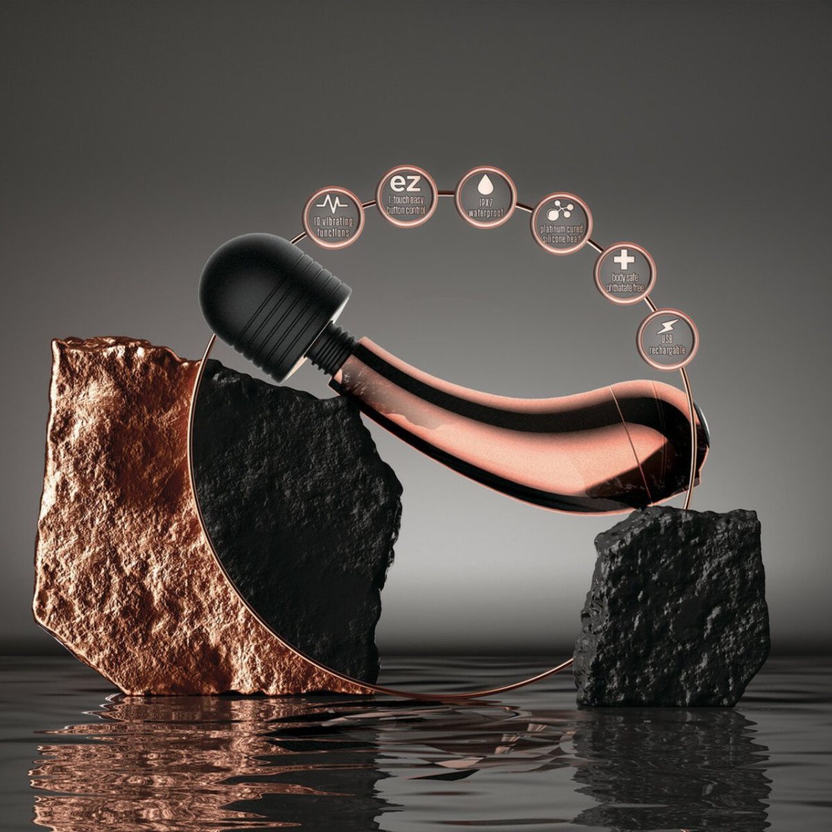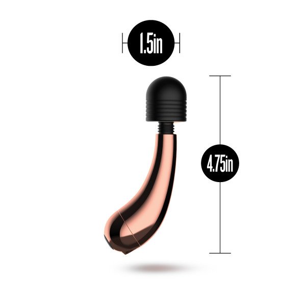 Lush Callie Massager Rose Gold from Blush Novelties. Pleasure shines with Lush Callie. Its rumbly vibes pair with rose gold accents. The ergonomic handle and flexible neck make Callie comfortable to hold. Explore 10 rumbly vibration functions, solo or with a partner. Callie is waterproof, USB magnetic rechargeable, and easy to clean. Made of body safe materials: non-porous ABS plastic and a smooth silicone sleeve. Free of phthalates and latex. Shine. Elegant design plus compact. Power to let your pleasure shine. Explore. 10 rumbly vibration functions and a flexible neck. Waterproof. Rated IPX7 for bath time play. Easy. Utilizing magnetic charging technology. Size 4.75 inches in length by 1.5 inches in width. Color Rose Gold handle, Black head. Materials ABS Plastic handle, Silicone head. Length 5 inches, width 1.5 inches. Circumference 4 inches. Battery type: Lithium Polymer. 30 days warranty. Blush Novelties – Lush. Categories: Vibrators, Rechargeable Vibrators, Magic Wands and Body Massagers, Body Massagers. Restricted, Amazon Restricted. 2022.