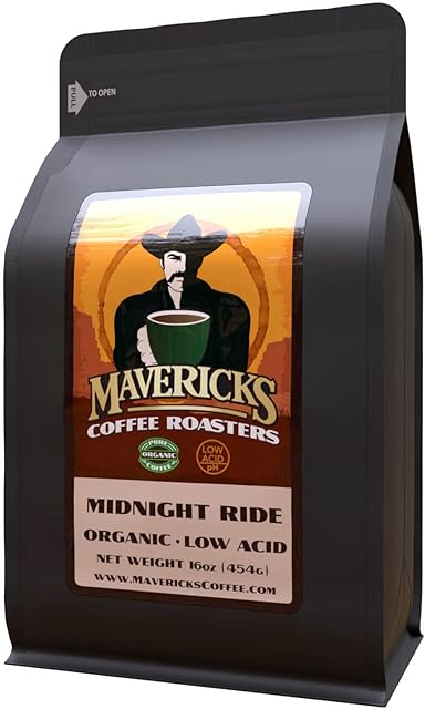 Mavericks Low Acid Coffee – Midnight Ride Blend – Organic and Non-GM0 (Coffee Ground) 16 oz – Bold and Smooth Dark Roast with 90% Less Acid – Safe for GERD and Keto Diets