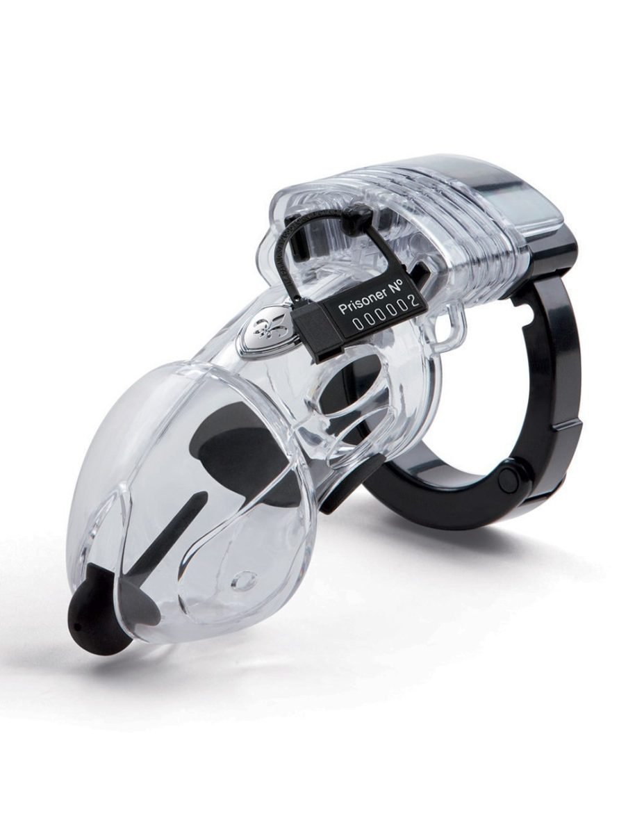The Pubic Enemy No 2 is our neat and transparent cock cage with e-stim function: He lets you keep a boisterous willy pent up under lock and key so that he can't get stiff until the mistress, or the master, comes with the key and lets him out. With the urethral sound and its 3 conducting surfaces, left, right and under the penis shaft the prisoner can be treated to your heart's content with tingles, twitches or pulsations in precisely the intensity he deserves. In order to make him fit for any men's best asset, the length of our Pubic Enemy No 2 can be individually adjusted in 4 lengths and the diameter in 6 different steps. Because his urethral sound and conductive surfaces can be taken out in no time at all, our chastity belt for wayward gentlemen is perfect even for those who haven't yet discovered e-stim. And if a prisoner gets too cocky later, the conductivity can easily be restored. A metal lock with engraved mystim shield and a set of 5 plastic seals ensure there is no escape from the Pubic Enemy. For forgetful subs there are enough name plates with the line "hands off – this prisoner belongs to…", which fit into the holder of the cage. Just as a little reminder who owns the cage's content. Dimensions: The Cage: inner diameter 34 mm at the mouth, 47 mm at the widest point. Length 82 mm; can be increased with the 3 spacers included. Each spacer adds 4 mm. The Clasp's inner diameter is variable in 6 steps from 33 mm to 52 mm. Please note you will require an e-stim device – like our Tension Lover, or the Mystim Pure Vibes – to activate the poles. One Year Warranty.