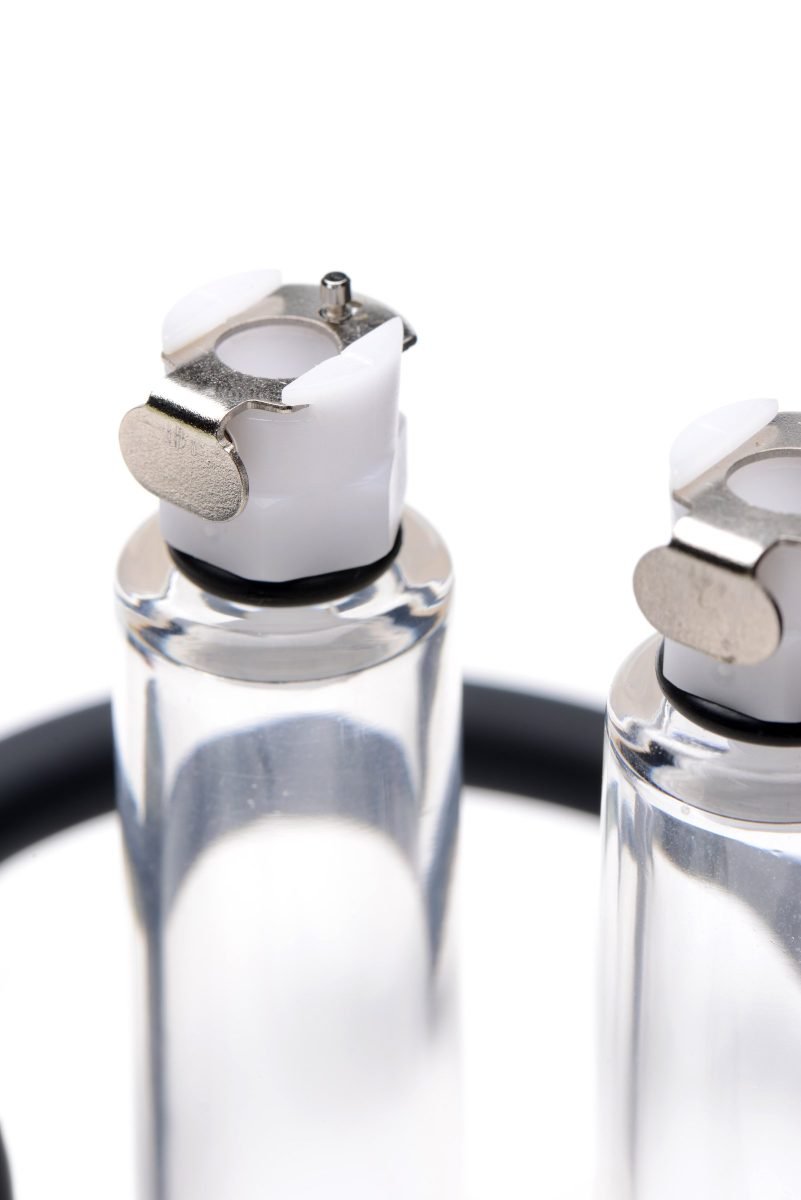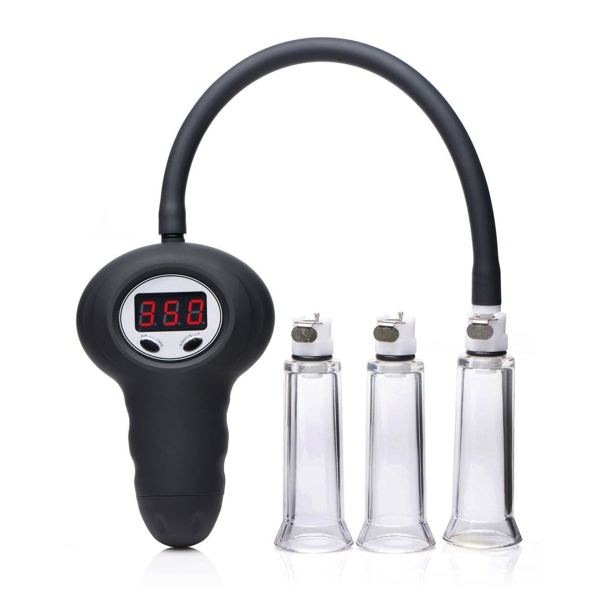 Engorge your smallest, most sensitive parts with a digital pump! Three small cylinders connect to the sturdy connector hose of this electric pump to pinpoint pleasure on nipples, the clitoris, and other small areas. Create a strong seal, with the aid of a lubricant if necessary, and experience the tight pulling sensation as your delicate flesh is drawn into the cylinder and blood flow increases. The digital pressure gauge displays how much suction your body is enduring as you become more and more swollen and sensitive. Two simple button controls make your pumping endeavors easy so that you can immerse yourself in the moment. Just press the Start/Stop button to begin and end the powerful pressure that builds within your cylinder. The convenient clasps allow each accessory to be disconnected from your pump while still retaining the pressure within, allowing the use of all three cylinders at once. Release your tender parts for access to more hands-on play with the Air Release button on the pump or by pressing the small silver button on the top of each cylinders clasp. Amplify your solo or partner play! Measurement: Pump is 5 inches in length, 3.5 inches in width. Hose is 10.25 inches in length. Cylinders are 3.8 inches in total length, 2.9 inches insertable, 1.1 inches in diameter at opening, .85 inches in diameter throughout length of cylinder. Material: Plastic, ABS, silicone Color: Black Note: Includes 3 cylinders and pump. Requires 4 AAA batteries, not included.