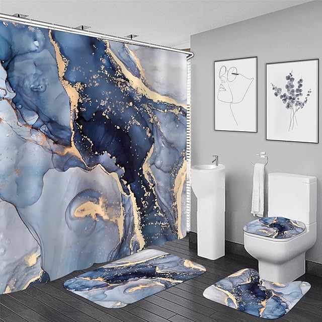 Nkzply 4 Pcs Blue Marble Shower Curtain Set Modern Abstract Bathroom Sets with Shower Curtain and Rugs Gold Fabric Shower Curtains for Bathroom Decor Accessories with Bath Rugs Toilet Lid Cover Hooks