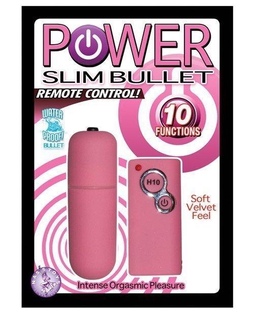 From Nasstoys comes the Power Slim Bullet Remote Control. This slim bullet features 10 pleasurable functions. Also the bullet is wireless and waterproof so use in the shower or bath. Phthalates free, RoHS compliant. Made of ABS with PU coating. 3 LR44 (AG13)-bullet, 1 27A, 12V-remote included. Length: 2.5", diameter-2.688".