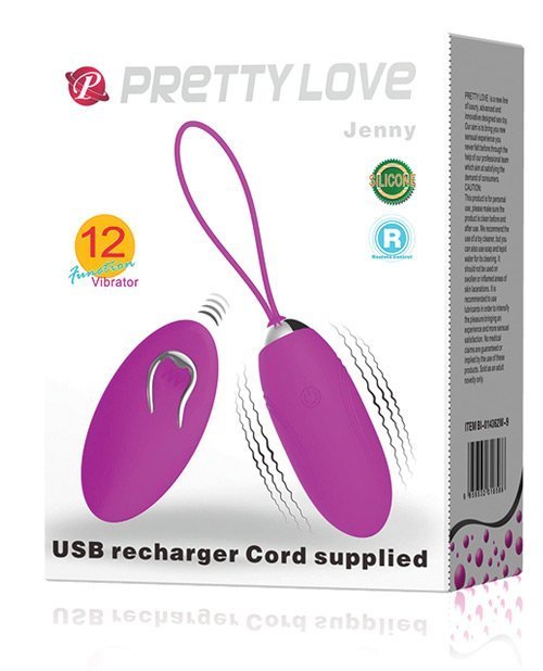 Pretty Love Jenny Remote Control Bullet Vibrator Purple. Pretty Love BI-014362W-9. A smooth egg with 12 powerful vibration settings. This multi-speed remote egg vibrator is perfect for couples or discreet solo-fun. Hand the controls to your partner and orgasm at home or in public, without anyone knowing and let them stimulate you to your heart’s content! From Pretty Love, Jenny is a USB Rechargeable remote control bullet vibrator with 12 vibrations functions. USB cord included. The remote requires 1 AAA battery, not included. Dimensions bullet is 28mm wide and 70mm insertable length e or approximately 2.75 inches by 1.10 inches. Pretty Love – Bullet Vibrator from Liaoyang Baile Health Care Product Co, Ltd.
