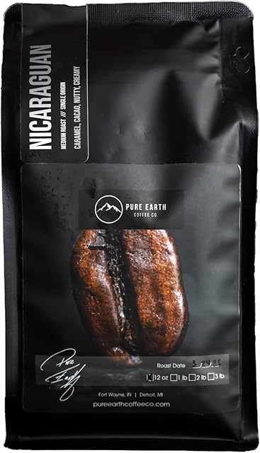 PURE EARTH COFFEE CO. Whole Bean Coffee, Nicaragua Single-Origin Beans, Medium Roast, Low Acid Gourmet Specialty Grade Coffee, Caramel, Chocolate, Nutty Flavor Notes 12oz