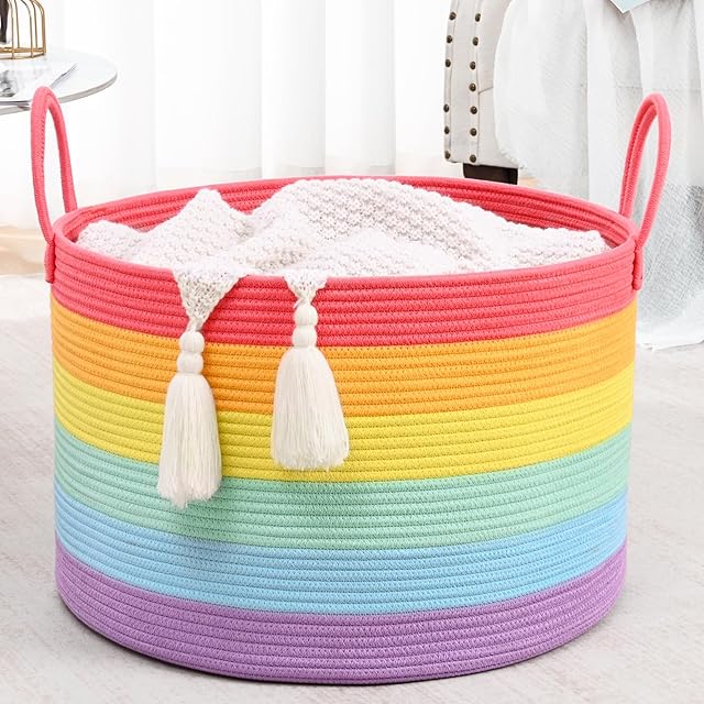 Rainbow Storage Basket for Organizing, 20″×13″ Large Laundry Baskets, Cotton Rope Woven Blanket Basket, Toy Storage for Kids, Collapsible Blankets Storage for Living Room, Nursery Room