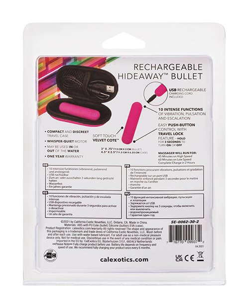 From the jet-set life to an adventurous love life, the Hideaway Bullet is your new favorite travel buddy. Slip the discreet travel case into your purse of handbag for knee-shaking pleasure wherever you go. The petite massager fits between your fingers to let you deliver pinpoint tantalization and thrill with intense vibrations. Get playful while you flicker through 10 indulgent vibration, pulsation and escalation functions with the easy-touch control button. Effortlessly control pure pleasure with an easy-touch silicone button and hold for 3 seconds to turn on/off. Use the smooth single button control to enjoy up to 1 hour of vibrating pleasure. Charge up your passion in only 2 hours by plugging the provided USB cable into the self-sealing charging port on the back of the massager. The slim massager discreet 3-inch size makes it the perfect travel companion, letting you embrace radiating pleasure wherever your fantasies take you.One Year Warranty.