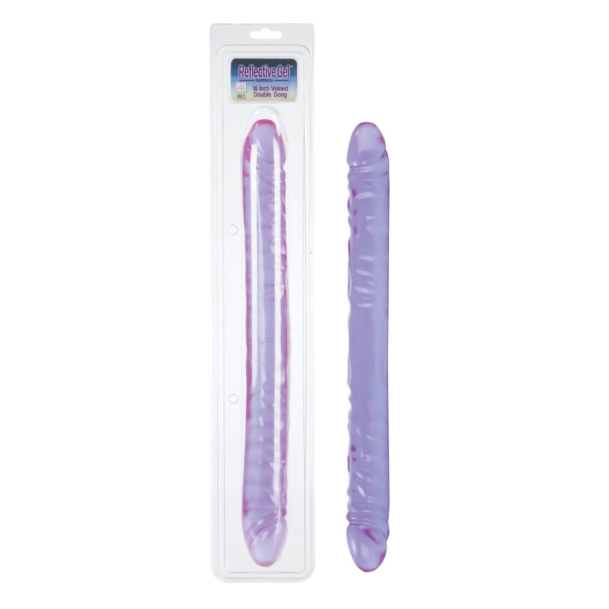 Lavender Jelly Veined Double Dong 18″. Reflective Gel Series is made from jelly soft, pliable materials. Versatile dong comes in the most popular shapes and sizes! Superior quality, hand finished. Phthalate free, non-toxic materials: high quality PVC. Soft lavender sparkling jelly dong with a thick veined texture and realistic head. Dong measures 17.5 inches long by 1.75 inches wide. Bulk weight 21.9 ounces. Dong can be used for anal, g-spot, vaginal and prostate stimulation. Lavender Jelly Veined Double Dong from California Exotic Novelties. Made in the USA. New images added Embrace Seduction California Exotic Novelties Web Image Library, DVD, Bulk, Catalog, Package.