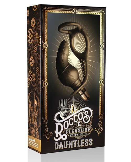 Dr Rocco's Pleasure Emporium presents Dauntless.Dr Rocco will take you on an adventure deep into your imagination. Feast your eyes on gadgets and remarkable devices that will excite, titillate and satisfy the most adventurous sexual appetites. Uniquely crafted to time-span the ages for a truly orgasmic fantasy romp! Time to lace up your corsets, hang on to your boot straps and enjoy the ride.Make ready for an epic escapade ! Superbly fashioned for ultimate satisfaction . Gentleman's prostate and perineum massage apparatus. Flexible Firm C ring for long lasting pleasure . 10 powerful vibrational settings . Hands free . Body safe. AAA battery included.