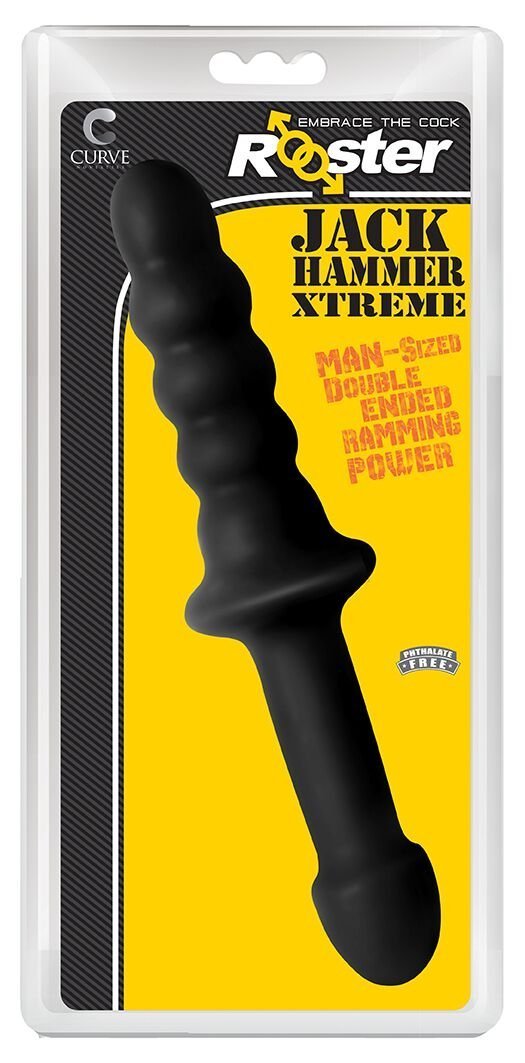 Curve Toys Rooster Jackhammer XL Black Double Ended Anal Probe. Perfectly sized for intense thrusting. Double sided thruster probe. Use as a rammer or built in handle doubles as a smooth dong. Rounded tips for easy insertion. Pliable yet firm with flared hilt for safety. Materials Enhanced PVC, Latex free, ultra premium. Dimensions 11.5 inches by 1.87 inches, 6.5 inches insertion length. Care instructions: clean with soap and warm water or toy cleaner before and after use. Use with any water based lubricant or silicone based lubricant. Rooster embrace the cock. Probe into pleasure with the Rooster collection of sex toys for men. Enjoy the satisfaction anal toys offer with our line of plugs, enhancers, dildos, cock rings, and beads. Made with a variety of materials our designs are crafted with your desires in mind. Find the perfect fit with our wide range of smooth, tapered, textured, and realistic designs offering unstoppable pleasure. Categories: Anal Toys, Prostate Massagers, Probes, Sticks, Rods, Double Dongs. 2022.
