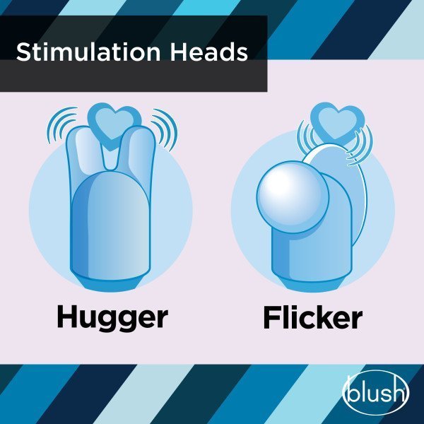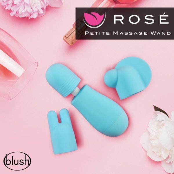 Rose Petite Massage Wand Blue from Blush Novelties. Discover new sensation with deep vibration plus 2 extra head styles. Explore 10 rumbly vibration functions and a flexible neck. Waterproof for easy cleaning. Peace of mind. Made of non-porous ABS Plastic and Pure Silicone sleeves. Contains no Phthalates or Latex. Size 4.75 inches in length by1.5 inches in width. The Rose Petite Massage Wand kit comes through with rumbly vibes and more sensation options! This mini wand includes 2 stimulation heads, for exploring pinpoint or surround sound clitoral stimulation. Cute and compact, Rose Petite’s easy grip handle and flexible neck help ensure comfortable use. Play with 10 deep vibration functions, solo or with a partner. The Rose Petite Massage Wand Kit is waterproof and easy to clean. Made of body safe materials: non-porous ABS plastic and interchangeable silicone sleeves. Free of phthalates and latex. Massager requires 2 AAA batteries, not included. Includes to stimulation heads: Hugger and Flicker. Categories: Magic Wands & Body Massagers, Body Massagers, Palm Size Massagers, Sextoys for Women. Restricted, Amazon Restricted. 2022.