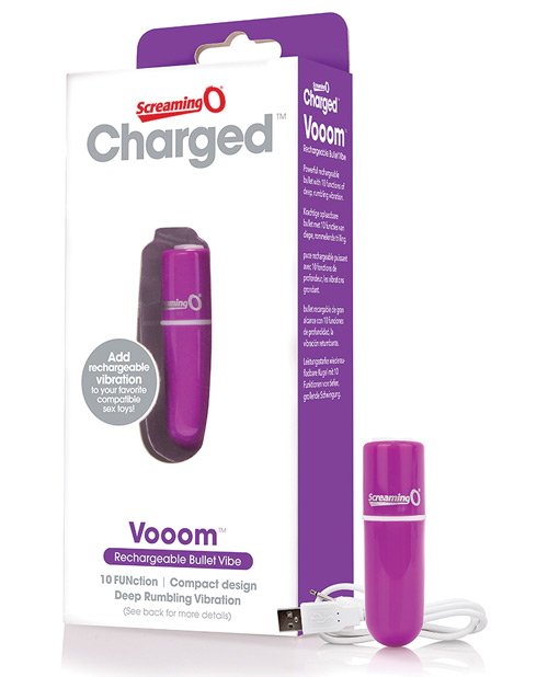 Enjoy powerful portable vibration with Charged Vooom, a unique 100% waterproof bullet vibe equipped with a 10-function motor that hums at a frequency unlike anything you've ever felt! Rather than a traditional buzz, this new technology rumbles deep for penetrating pleasure and a dramatically different sensation that can be enjoyed almost anywhere! Its sleek shape means it also can fit most existing Screaming O products and give them an intense power boost. At its highest speed, Charged Vooom vibrates for more than 60 minutes and recharges easily with a convenient USB connector (included) that plugs in securely and stays put for the duration of the charge – hassle-free charging at its finest! Charged Vooom also comes equipped with a 2-year limited warranty, so you can enjoy penetrating pleasure with confidence. Enjoy Charged Vooom on its own or use it to add powerful rumbling vibration to your favorite compatible intimate accessories!