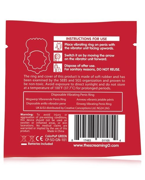 The Screaming O Vibrating Ring is the award-winning sex secret that helps couples have better, more satisfying sex! With pleasure knobs for him and ticklers for her, couples enjoy mutual stimulation with vibration that buzzes throughout the entire ring. Now available as a convenient ColorPoP Quickie, couples can enjoy vibrant vibration at home or on the go with a disposable design they can take anywhere!