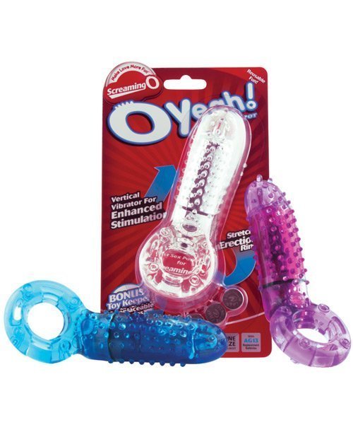 Oh, yeah! The O Yeah from Screaming O is a super-powered vertical vibrating ring with an angled design for maximum clitoral contact and stimulation in addition to the super-stretchy erection band that keeps him firmer longer. Comes with removable bullet powered by replaceable watch batteries.
