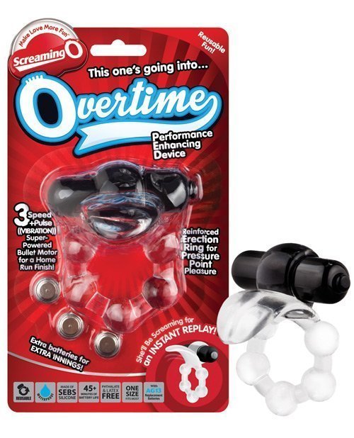 The Overtime helps couples hit a home run in the bedroom with a super-powered 4-function motor and flexible Ace Hitter flutter tip to tickle and tease. With a stretchy erection ring reinforced to keep him hard and in the game, this ultimate performance enhancing device gives couples a double header with extra innings and an impressively strong finish. Reusable with replaceable AG13 batteries that last 45+ minutes.