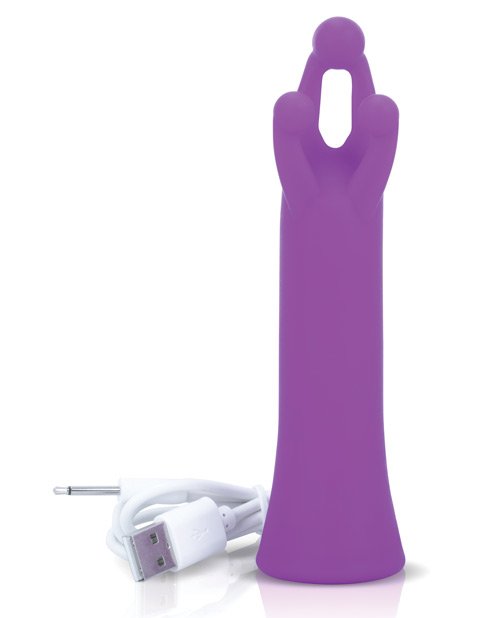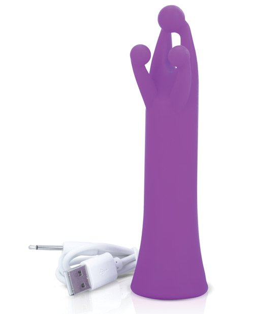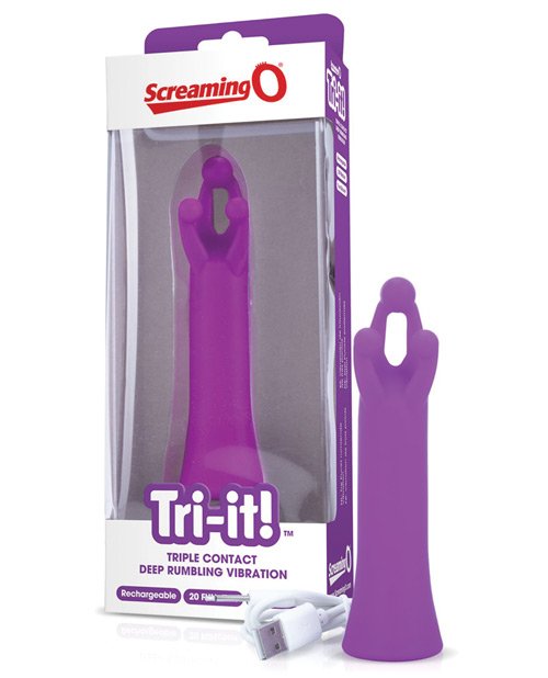 Tri-it is a triple contact toy with 20 functions. Deep rumbling vibration, intense sensation from the 3 contact points. Waterproof. Material: Silicone Color: Purple USB rechargeable, cable included. 60 minute of play time from one charge Dimensions- 5.25 overall length – widest diameter 1.25 inches 2 year limited warranty (details inside package)