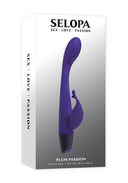 Selopa Plum Passion Rabbit Style Vibrator from Evolved Novelties. Sex, Love, Passion. Plum Passion Rabbit Style Vibrator features: elegantly slim and flexible, this dual motor toy curves with a gentle arc designed to effortlessly reach the G-Spot. Simultaneously, a hard working stimulator shaft buzzes with its own powerful motor, featuring a very flexible 2 pronged clitoral tickler. Textured and flexible G-Spot Vibrator with clitoral tickler. Vibrations 2 powerful motors, controlled together; 10 powerful vibrating speeds and functions. Made with body safe materials. Phthalate free and latex free Silicone. Waterproof vibrations. 5 years warranty. Rechargeable via a USB port. Pinpoint connection to recharging is quick and simple. Cable included. Bulk weight 2.3 ounces. Plum Passion with packaging 4.5 ounces. </div></div>Dimensions: height 7.21 inches, depth 1.97 inches, width 0.99 inch, diameter 0.93 inch. </div>Insertable length: 5 inches. </div>Categories: Vibrators, Rabbit Style Vibrators, Rechargeable Vibrators, Sex Toys for Women, G- Spot Flexible Vibrators, G-Spot Rabbit Style. 2023.</div>