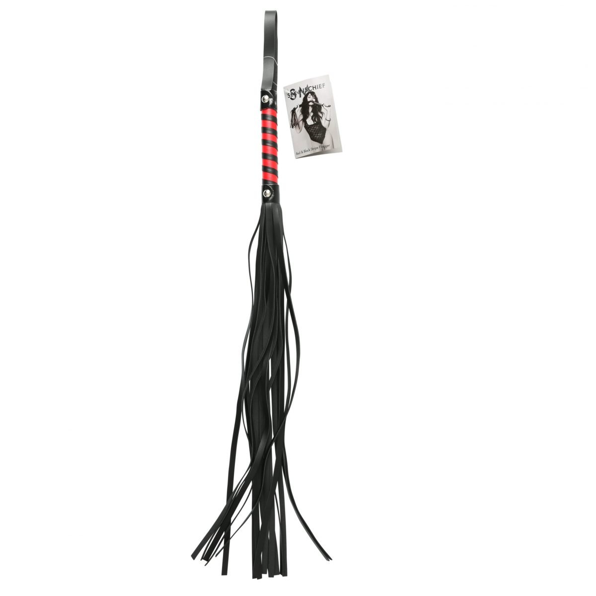 Be naugthy and enjoy the spanking with this 32 inch Red and black stripe flogger. This flogger is made of vinyl fabric nickel free metal harware and wood.