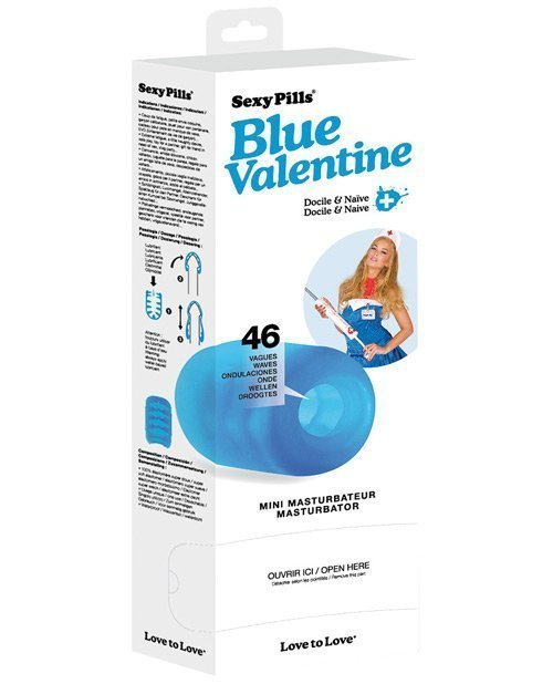 These pills contain a great masturbator for men. Masturbators Sexy Pills are small but perfectly fulfill their role. The Blue Valentine pill features 46 waves inside each masturbator for fun sexy solo play. It's just what the doctor ordered! Designed for one time use. Made from 100% super soft elastomer. 1 box contains 6 masturbators. Front of box can be opened and turned into a dispenser allowing display of packaging. Size 30.6cm by 11.2cm by 5.35cm e or approximately 12.04 inches by 4.40 inches by 2.10 inches.