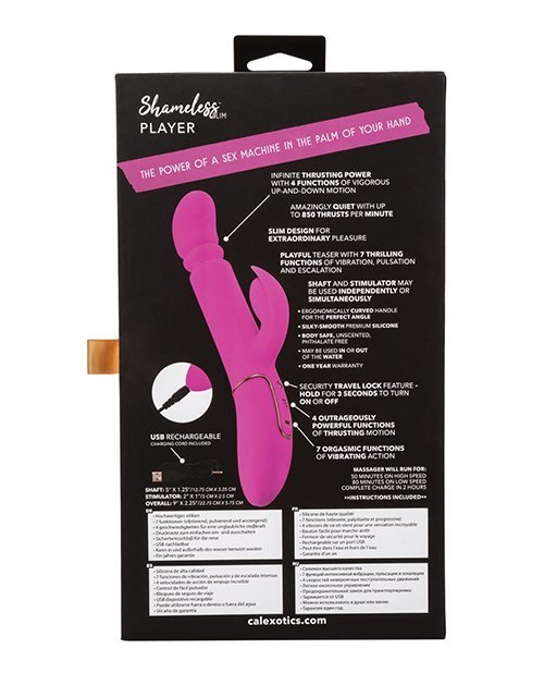 The power of a sex machine in the palm of your hand – now that's Shameless! This luxury massager is unapologetically powerful with up to 850 thrusts per minute and a vibrating stimulator that will blow your mind. With a sexy, slim shaft; this sensational vibe has it all.
