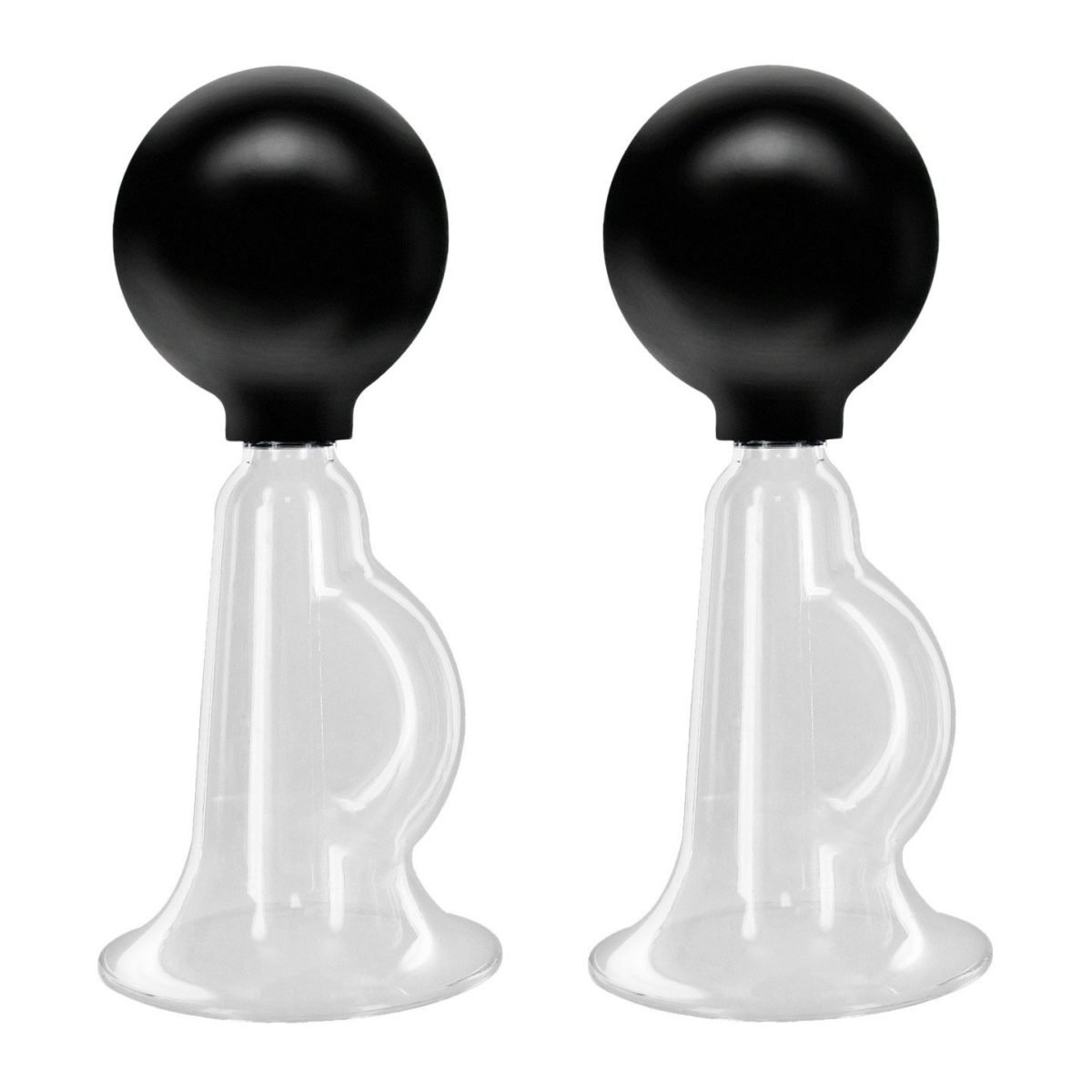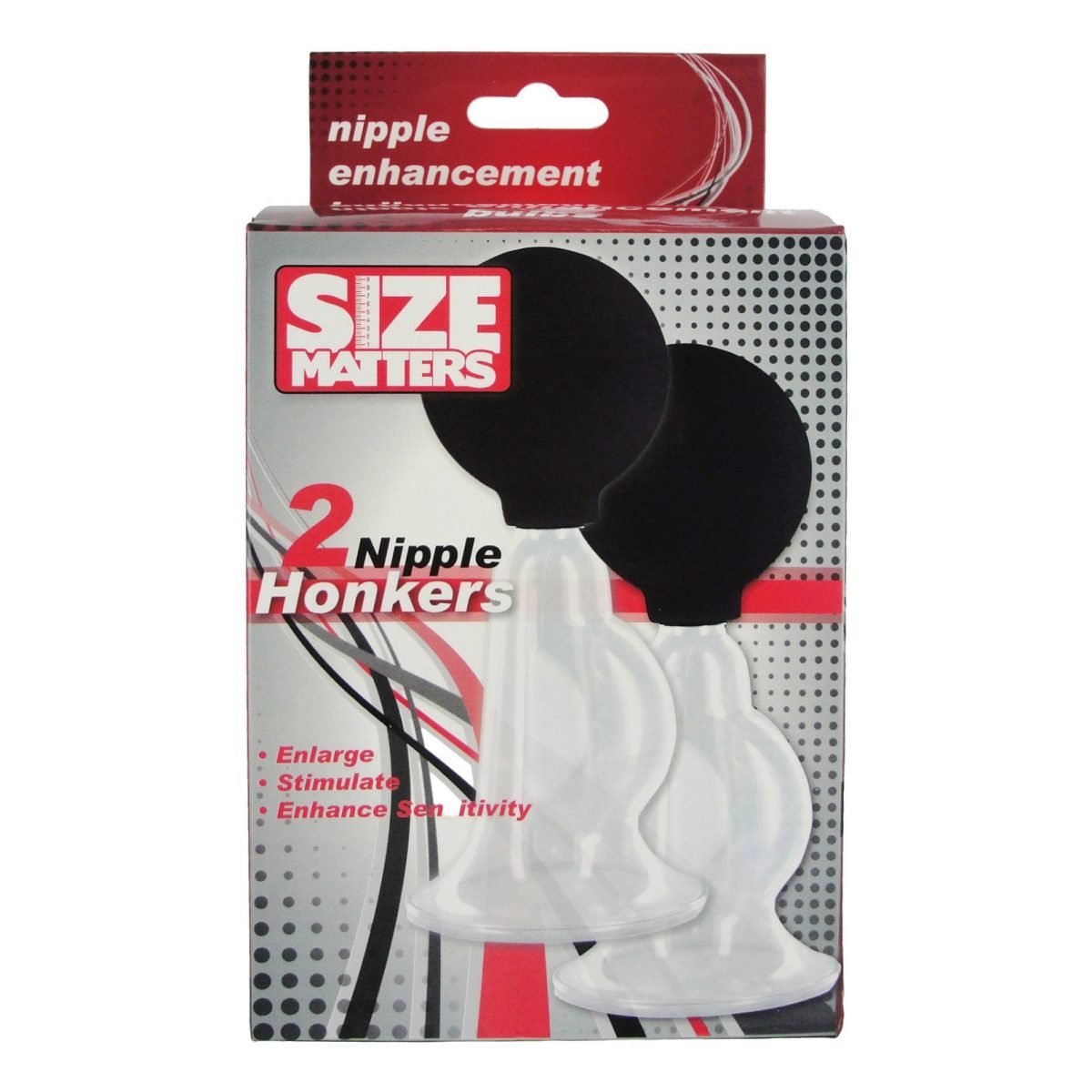 The Size Matters Nipple Honkers can enlarge and stimulator your nipples. Engorgement and increased blood flow to the nipples increases sensitivity and pleasure. Simply place them over the nipples and squeeze the bulb. The nipple honkers will create a vacuum sensation when you release your grip. After you release them, they will stay in place and you may enjoy hands free stimulation! The special extra cavity design accommodates nipple piercings, as well. Measurements: 5.38 inches total length, 2.38 inch inner diameter of nipple bell opening, 2.1 inch diameter bulb Material: ABS, Rubber Color: Clear and Black