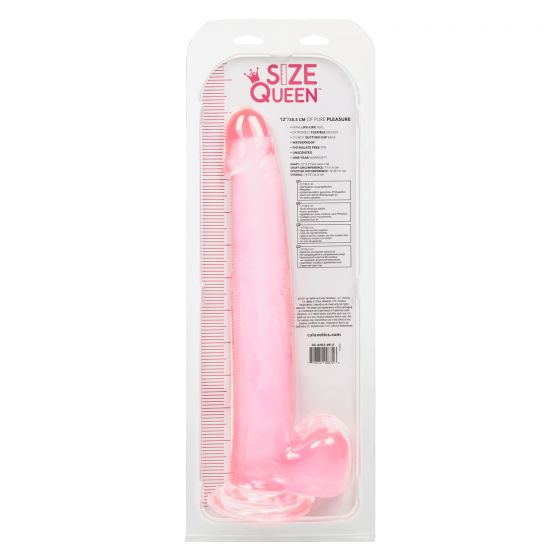 Size Queen 12 inches Pink Dildo from California Exotic Novelties. For the Size Queen who knows exactly what they want, the 12 inches Size Queen is a full 12 inches long, with a 14.25 inches over all size of life like pleasure. The 12 inches dong is firm yet flexible feel and will ensure you receive exactly what you are looking for, including a realistic head and veins. With a sturdy, suction cup base you can have your play on a chair, in the shower or anywhere you desire that has a firm and non-porous surface. Stop settling for the small stuff. Go after what you really want the extra large, 12 inches Size Queen. It is sure to hit the spot. The hand washable design ensures you endless hours of pleasure. Compatible with nearly all harnesses, the Size Queen 12 inches will fully deliver an erotic, life like experience you will not forget. Specifications: features Phthalate Free, Waterproof non-vibrating dildo. Features Phthalate free, unscented Thermoplastic Rubber TPR. 1 year warranty. Measurements 14.25 inches overall. 12 inches by 2 inches shaft. 12.25 inches scrotum circumference. 7 inches shaft circumference. Bulk weight 20.5 ounces. Package 27.5 ounces. Package 3 inches by 9.75 inches by 18.75 inches.