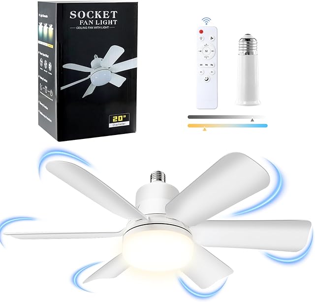 Socket Fan Light with Remote, 20″ Screw in Ceiling Fan in Light Socket with Extender & 6 Blades for Bedroom, Kitchen, White