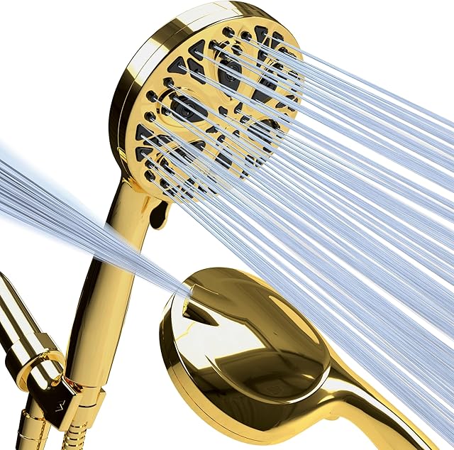 SparkPod 10-Mode Handheld Shower Head with Hose – 5″ High Pressure Shower Head Set with Touch-to-Clean Nozzles, Built-In Power Jet, Stainless Steel 6ft Hose & Bracket (Egyptian Gold)