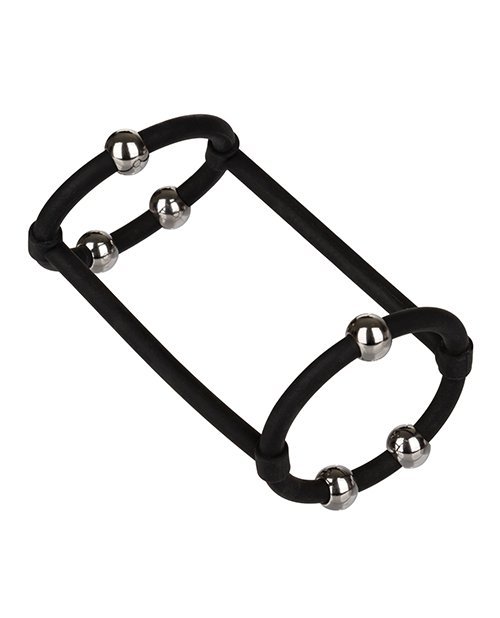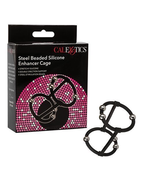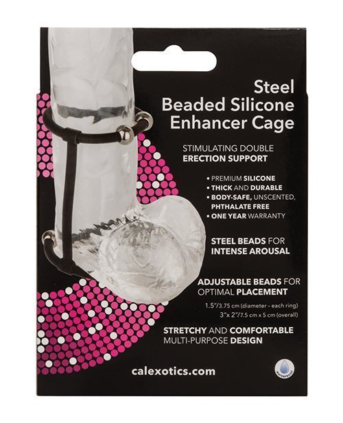Made to enhance, escalate and intensify ecstasy every time you slip on the Steel Beaded Silicone Enhancer Cage. The sturdy, yet stretchy silicone dual enhancer cage supports, while the moveable steel pleasure beads thrill you and your lover.The ultra-stretchy dual erection support ring is sure to enhance pleasure by increasing stamina, sensitivity and girth. Look forward to an explosive pleasure experience with every teasing stroke of the steel pleasure beads with adjustable and moveable placement. This strong, supportive ring cage indulges your man with increased stamina, girth and sensitivity, while you can savor his increase stamina and girth, the thrilling stimulation beads tease you towards an orgasmic wonderland.The passionate pleasure ring is made of silicone and stainless steel pleasure beads. The diameter of each ring is 1.5? (3.75 cm) with and overall size of 3? x 2? (7.5 cm x 5 cm)Materials: Silicone, Stainless SteelMeasurements :7.5" x 3" x 2" / 5cm (Overall)1.5" / 3.75cm (Ring Diameter)One Year Warranty.