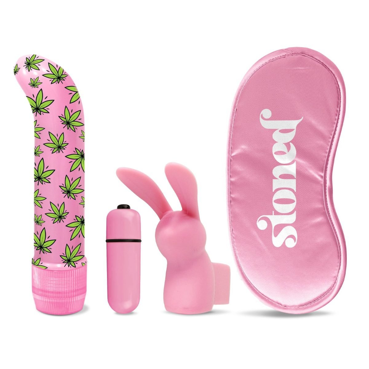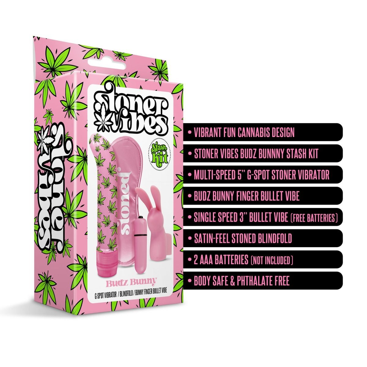 Stoner Vibes Stash Kit Budz Bunny from Global Novelties. Elevate your pleasure with the Stoner Vibes Stash Kit. Multi-speed 5 inches classic vibrator is sized for satisfaction and loaded for powerful vibes. An easy dial control at the base lets you twist a little for low vibration and keep twisting until you hit the highest power. Vibrator uses 2 AAA batteries, not included. Vibe can be used with any type of personal lubricant. A sleek weed design makes this blue vibrator a truly mind blowing trip! Thick and stretchy ring keeps you rock hard and ready to roll or can be used on the vibrator for added external stimulation. Single speed bullet vibrator adds vibration for intense sensations that will turn you or partner into a vibrating love machine. Also included is a pink satin feel stoned blindfold. Highten the moment! Wear to create anticipation and amp up other senses like touch, smell and taste. Sleep, smoke, vibe and repeat! Global Novelties – Stoner Vibes. Categories: Vibrators, Sex Toys for Couples, Sensual Kits, Vibrator Kits. 2022.