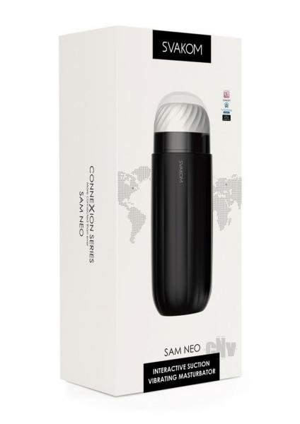Interactive and innovative high-tech masturbator   A rechargeable masturbator with a long-lasting battery life. Detachable sleeve for easy cleaning and maintenance, featuring highly-effective suction technology to create an authentic experience. Better yet, Sam Neo is a staple of the SVAKOM Connexion Series allowing it the benefits of APP Control to unlock further modes and play styles, alongside providing interactivity through partnership with FeelConnect. Easy to connect, Sam Neo offers a wide variety of compatible websites for syncing with interactive videos. Further, Sam Neo is capable of connecting to live cam shows to propel cam shows to new heights.   APP Controlled, Enjoy with Whoever You Want, Wherever You Are Controlled remotely via APP, give up the power and let your partner lead you on a journey of pleasure, from anywhere, at any time.   Connect to 2D Interactive Videos A real-time interactive function will allow you to sync with your favorite 2D interactive videos and let your favorite content take you to new and better heights.   Suction + Vibration An exciting fusion of a vacuum-like effect and fierce vibrations for you, a once-in-a-lifetime experience.   Exquisite Design SAM NEO serves a well-crafted sleeve, designed to tirelessly stimulating each bit of your anatomy.   Extended Joy A non-stop ride of ecstasy for over an hour. No more time limitations, just sit back and relax.