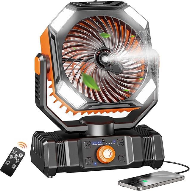 SWEETFULL Portable Misting Fan Rechargeable, 20000mAh Battery Powered Camping Fan with 300ml Water Tank & LED Lanter, Remote Auto Oscillating Table Fan with Hook for Travel Outdoor Tent Beach (Orange)