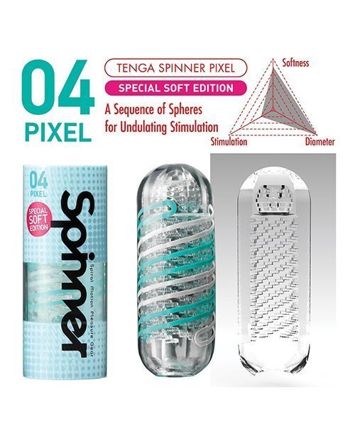 The all new Tenga Spinner Special Soft Edition is named due to its all-new internal coil which makes the SPINNER twist as you insert, sending unbelievable sensations with each stroke! Enjoy a unique sensation like none other with this Tenga Spinner Special Soft Edition. With the Tenga Spinner New Soft Edition 04 Pixel, expect a gentler experience with its softer material and slightly more generous inner diameter. Its sleeve entwined with delicate step-like ribs for pleasurable stimulation. The end chamber features ribs to stimulate the sensitive glans. Product Details: Material: PP, PS, PE (Case) – Elastomer (Sleeve) Length (Product): 140mm (5.5") Insertable Length/Stretches to approx (Product): 170mm (6.73") Width/Stretches to approx (Product): 55mm (2.15")