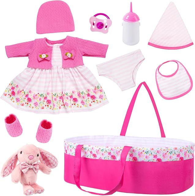 The 10 Pcs Baby Doll Clothes with Bassinet for 13-16 inch Doll, Baby Doll Reborn Outfit Clothes Accessories Including Bib Nursing Bottle Rubber Pacifier Hat with Peony Pattern