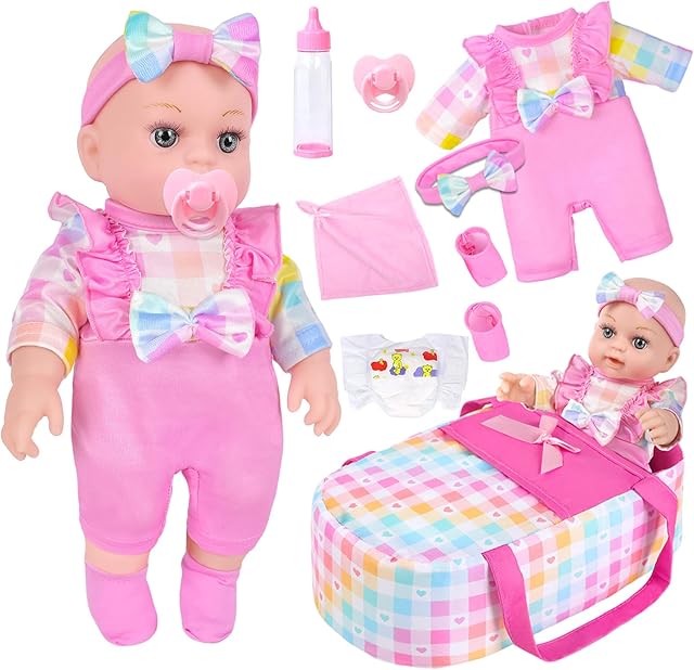 The 12″ Girls Baby Doll With Carrier Bassinet Bed,Pink Plaid Pattern Newborn Baby Dolls Playset With Clothes And Accessories Include Blanket Bottle Nipple Toy Stuffs Gift For Baby Toddler 36 Months And Up