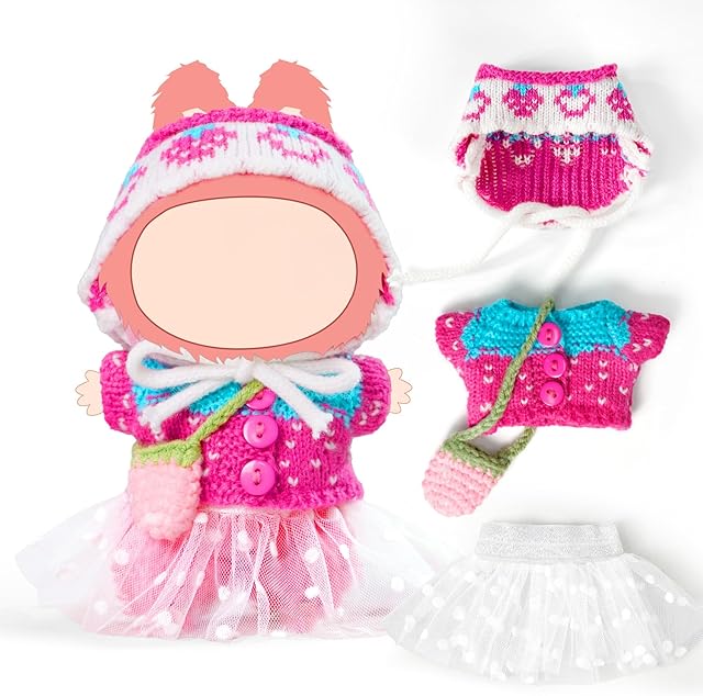 The 17cm Doll Clothes-Crochet Outfit Accessories Set for 5.91-6.7inch -Crocheted Hat+Pink Strawberry Sweater+White Dress+Bag(NO Doll)