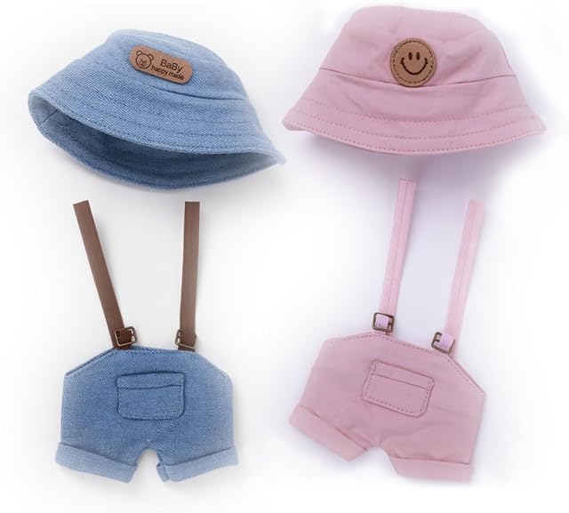 The 2-Pack Clothes for 17cm Doll – Blue and Pink Denim Overalls with Fisherman Hats, Casual Outfit Set for Collectible Accessories and Party Decoration