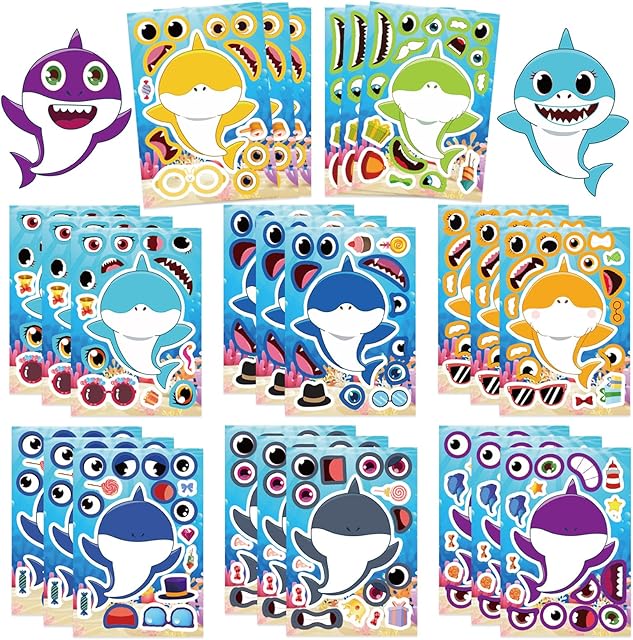The 24 Sheets Shark Stickers for Kids,Make Your Own Shark Decor,Boys Make a Face Cartoon Stickers,Colorful Kawaii Sharks DIY Deals,Classroom Rewards,Art Craft Party Supplies