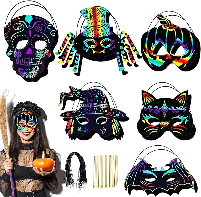The 24Pcs Halloween Scratch Mask Art, Magic Rainbow Scratch Paper Crafts Kit with Witch Skull Ghost Pumpkin Designs, Halloween Party Favors DIY Decorations Classroom Activities Supplies