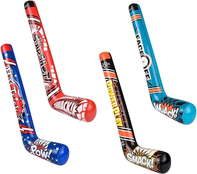 The 35″ Inflatable Hockey Sticks (4 Designs) Splash it! Thwack! Hat Trick. Pow! Power Play Smack! Face Off! Whack! Colorful. Vinyl. Great Party Favor (12 Pack – Random 4 Designs)