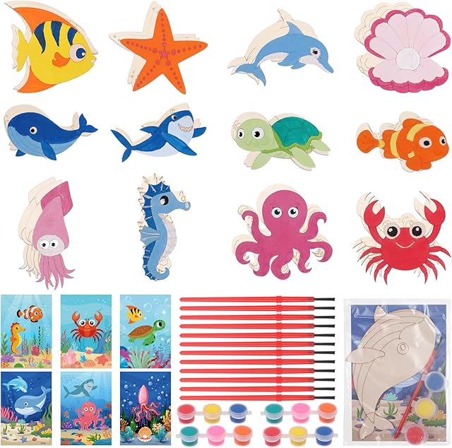 The 36 Set Sea World Wooden Painting Craft Kits Under The Sea Party Favors Ocean Animals DIY Wood Painting Kit Thank You for Coming Gifts Coloring Crafts for Birthday Classroom Rewards Goodie Bags Fillers