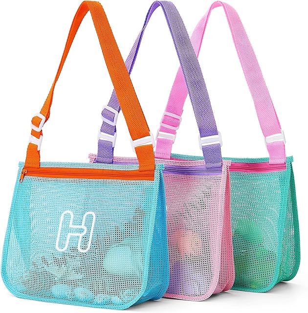 The 3Pcs Alphabet Printed Seashell Bags, Lightweight & Foldable Kids Beach Toy Mesh Bags with Adjustable Straps, Portable for Pool and Beach Essentials-H